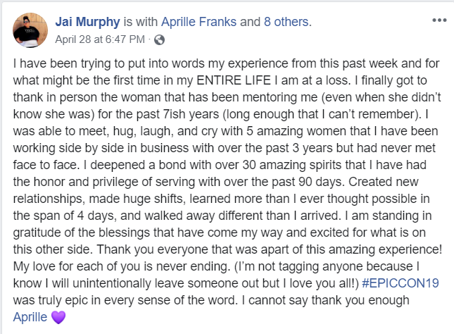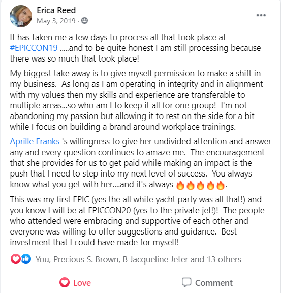 LOVE NOTE: Come for the transformation of yourself, your clarity and your business growth. At EPICCON you'll know how to get more clients within 30-days with any size audience or list authentically. The pieces that you have "all over the place" right now, will fall into the right sequence. And yes, you'll be inspired, connect with others and learn from Experts who are doing what they teach.